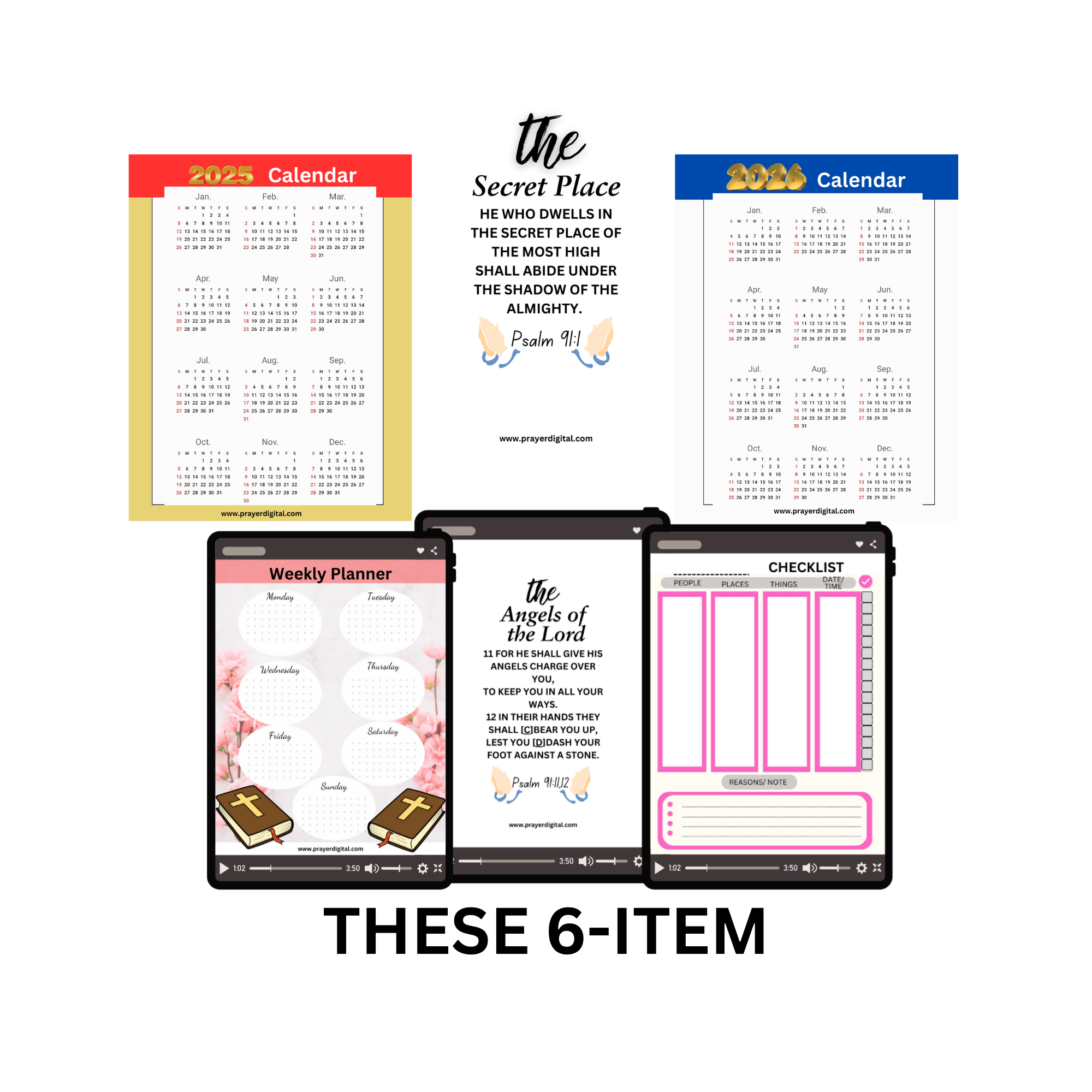 Power, Beauty, and timing are at work to complete this amazing bundle: a weekly planner, a checklist, 2 powerful Psalms 91 wall art( The Secret Place and The Angels of The Lord), A 2025 and 2026 Calendar.